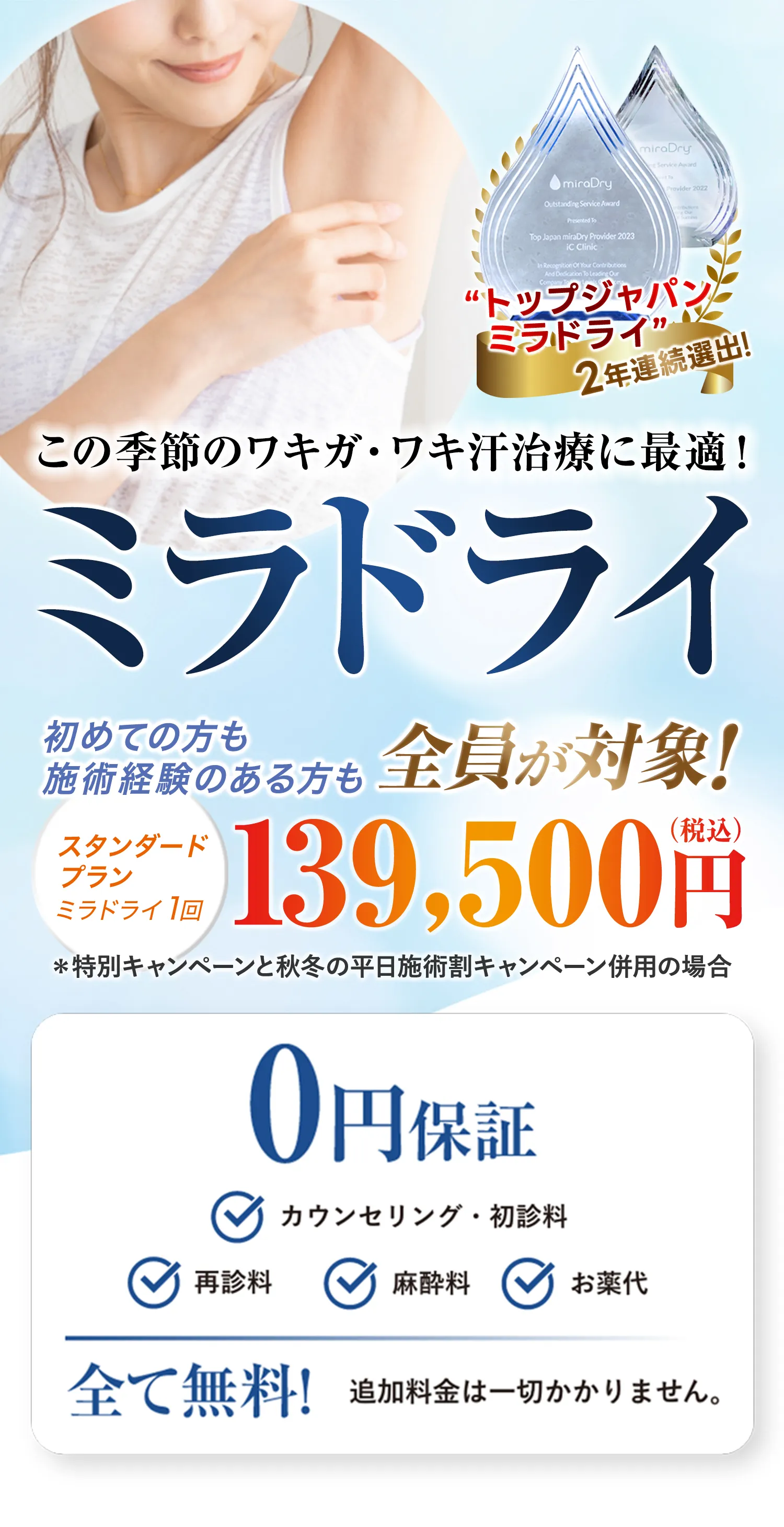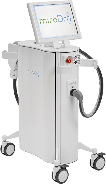 ミラドライは、マイクロ波を皮膚の上から照射するマイクロ波で、その熱によりワキのニオイと汗の原因となる2つの汗腺を破壊します。マイクロ波により汗腺が破壊されほぼ再生しないため、長期的な効果を期待できます。