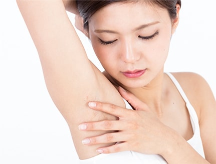 一般的に嫌なニオイとなるのは、アポクリン汗腺が毛穴から分泌物を出し、これが空気に触れることで毛穴にいる細菌と混ざり合い、臭いの元となる物質を作るからです。また、アポクリン汗腺はワキだけでなく、VIOなどのいわゆるデリケートゾーンにも多く分布するため、いわゆるすそワキガというお悩みをお持ちの患者様もいらっしゃいます。