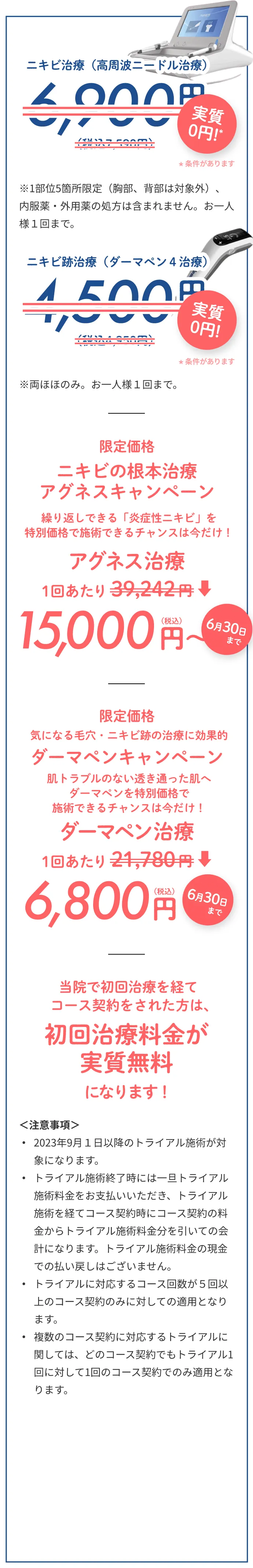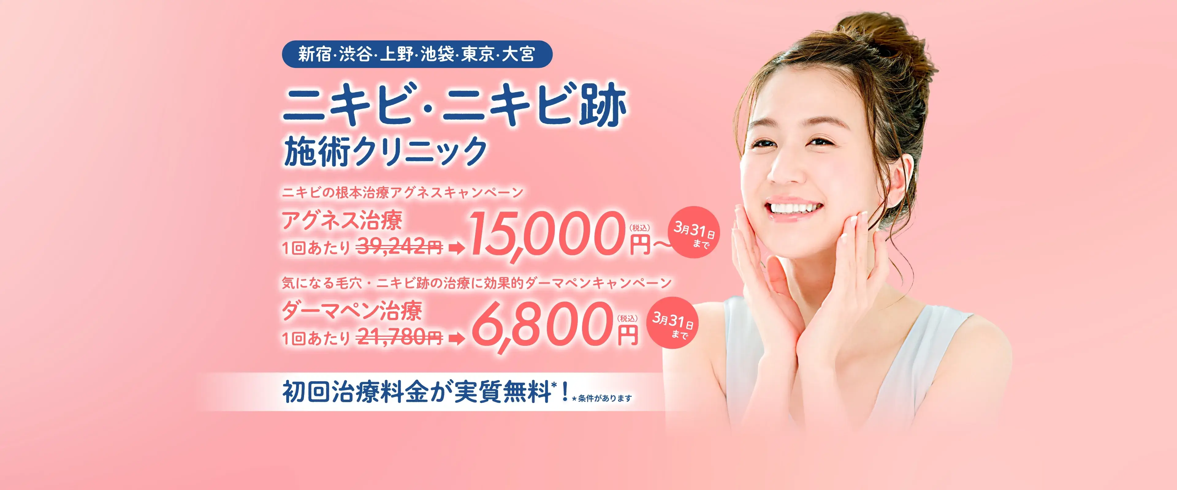 当院では、ニキビ治療には、専門的に用いられるアグネスと呼ばれる医療機器を用いた「攻め」の施術と、「守り」の内服薬・外用薬治療を行います。また、ニキビ跡治療には、専門的に用いられる「ダーマペン4」と呼ばれるニードルを使用した施術を行います。患者様の状態に合わせたきめ細やかなニキビ・ニキビ跡治療が可能です。