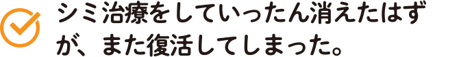 シミの深さによっては、再発する場合があります。また、かさぶたが剥がれた後、一時的にシミが残っているかの様な色素沈着ができることがありますが、こちらは時間が経つと自然と薄くなっていくもので、シミが再発したわけではありません。